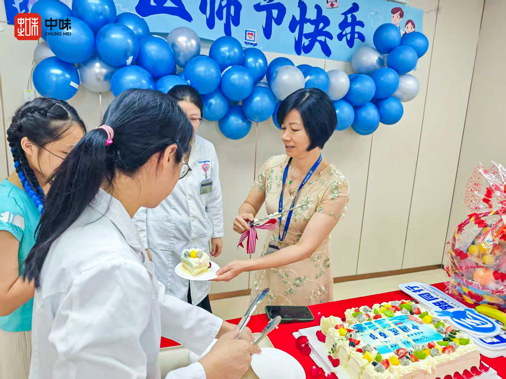 醫護代表切開節日蛋糕,一份份“滿甜星”帶著“感恩醫者擔當 守護生命之光”的祝福送到守護生命健康的“醫路滿天星”手中,漾出滿室歡欣。?
